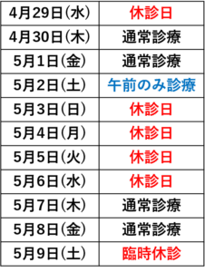 ゴールデンウィーク期間中の診療日についてお知らせいたします。